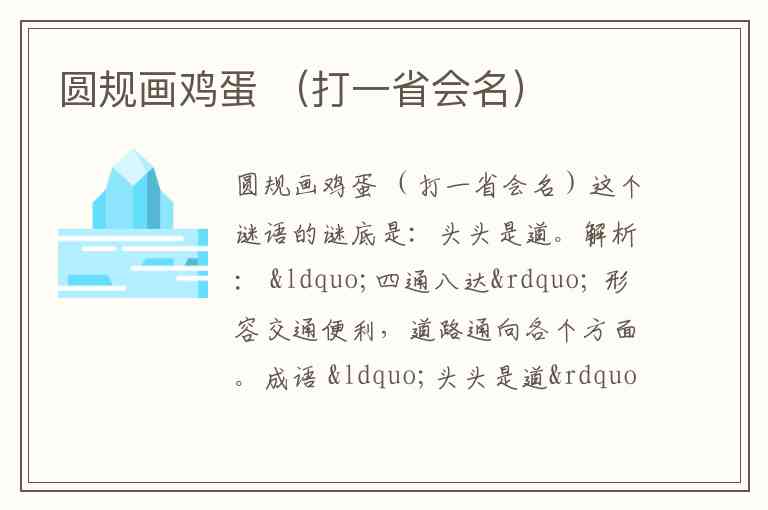 解谜思路:“圆规”画的应该是很“圆”的图形,但它却用来画不圆的“鸡蛋”,这个行为本身强调的是“过于圆了”或“画得太圆了”。将“太”和“圆”这两个字组合起来,就得到了谜底——山西省的省会 太原 。