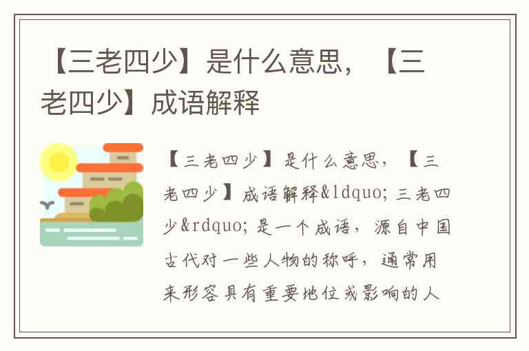 “三老四少”是一个成语,源自中国古代对一些人物的称呼,通常用来形容具有重要地位或影响的人物。这个成语的字面意思是“三位年长的、有经验的老人”和“四位年轻有为的少壮者”。