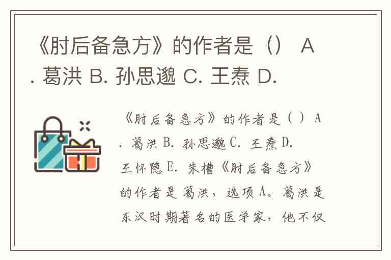 《肘后备急方》的作者是() A. 葛洪 B. 孙思邈 C. 王焘 D. 王怀隐 E. 朱槽