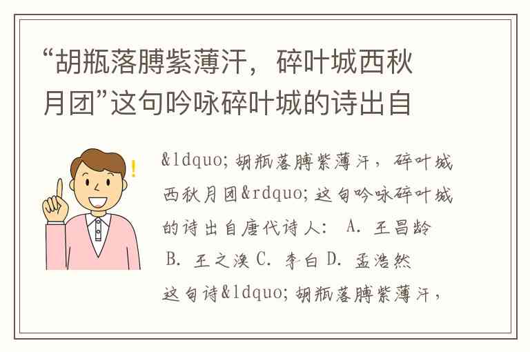 “胡瓶落膊紫薄汗,碎叶城西秋月团”这句吟咏碎叶城的诗出自唐代诗人: A. 王昌龄 B. 王之涣 C. 李白 D. 孟浩然