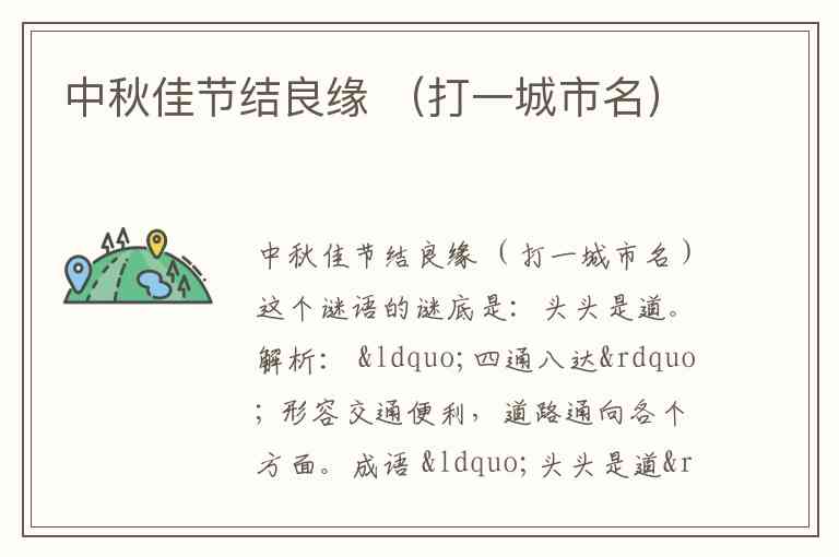 组合解读:“中秋”是一喜,“结良缘”是另一喜,合起来就是“双重喜庆”,简称“重庆” 。这个谜语生动地体现了汉语的简洁与智慧。