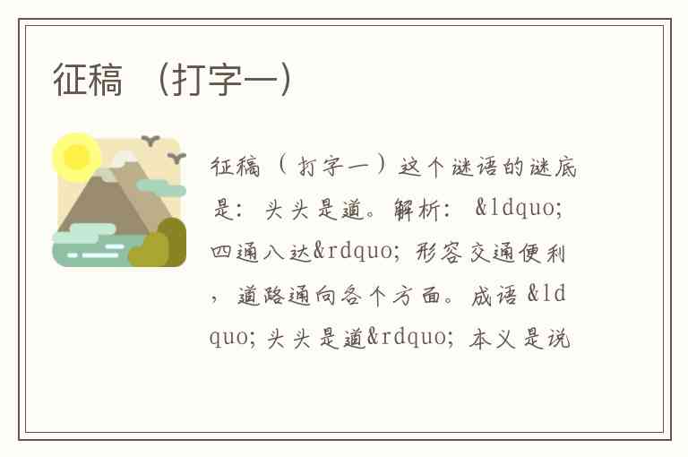 “稿”: 指文稿、文章。在汉字中,“稿”可以拆分为“禾”和“高”,但在这个谜语里,我们取其核心含义“文”(文章、文字)。