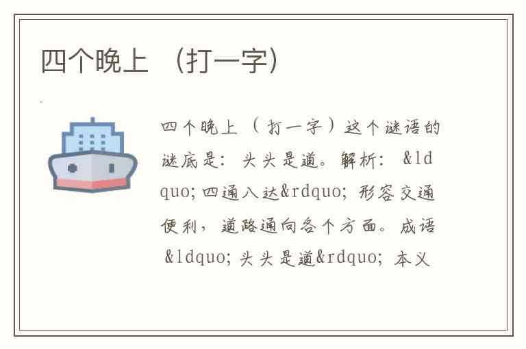 组合解读:将“四”和“夕”上下组合起来,就构成了“罗”字的繁体形式“羅”。不过,在现代简体中,“罗”的上半部分“罒”俗称“四字头”,其本身就可以理解为“网”或由“四”演变而来,而下半部分与“夕”形似。因此,谜面“四个晚上”会意为“四”和“夕”,组合成字“罗”。