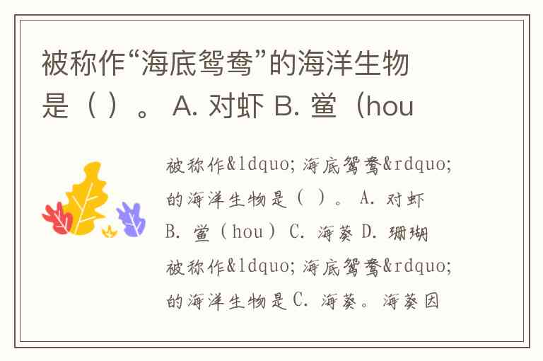 被称作“海底鸳鸯”的海洋生物是( )。 A. 对虾 B. 鲎(hou) C. 海葵 D. 珊瑚