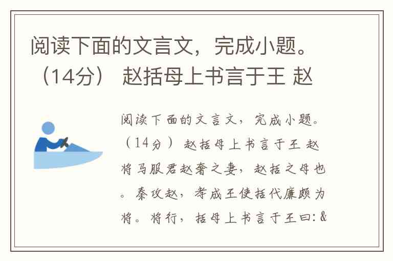 阅读下面的文言文,完成小题。(14分) 赵括母上书言于王 赵将马服君赵奢之妻,赵括之母也。秦攻赵,孝成王使括代廉颇为将。将行,括母上书言于王曰:“括不可使将。”王曰:“何以?”曰:“始妾事其父,父时为将,身所奉饭者以十数,所友者以百数;大王及宗室所赐币帛,尽以与军吏、士大夫;受命之日,不问家事。今括一旦为将,东向而朝军吏,吏无敢仰视之者;王所赐金帛,归尽藏之;乃日视便利田宅可买者。王以为若其父乎?父子不同,执心各异。愿勿遣!”王曰:“母置之,吾计已决矣。”括母曰:“王终遣之,即有不称,妾得无随乎?”王曰:“不也。” 括既行,代廉颇三十余日,赵兵果败,括死军覆。王以母先言,故卒不加诛。君子谓括母为仁智。 (选自西汉•刘向《烈女传•赵将括母》) 小题1:解释下列句中划线字的意思。(4分) ①始妾 事其父( ) ②王以为 若其父乎( ) ③故 卒不加诛 ( ) ④君子 谓括母为仁智( ) 小题2:下列各句与例句中“以”的用法相同的一项是( )(2分) 例句:王以母先言,故卒不加诛。