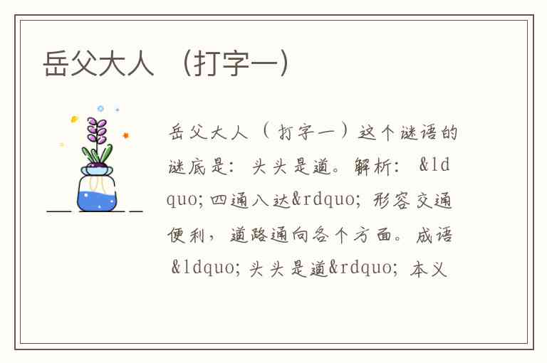 组合解读:将“岳父”(丈人)中的“丈”字,和“大人”(一个人)中的“亻”组合起来,就构成了“仗”字。