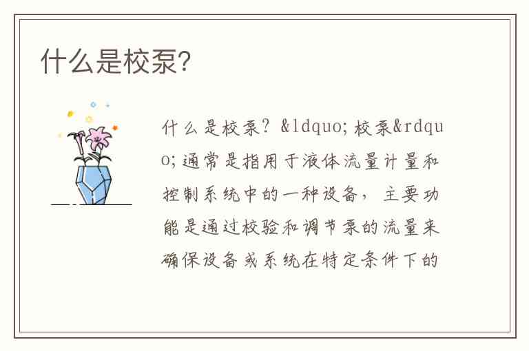 “校泵”通常是指用于液体流量计量和控制系统中的一种设备,主要功能是通过校验和调节泵的流量来确保设备或系统在特定条件下的精准工作。