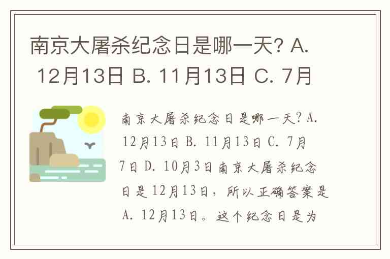 南京大屠杀纪念日是哪一天? A. 12月13日 B. 11月13日 C. 7月7日 D. 10月3日