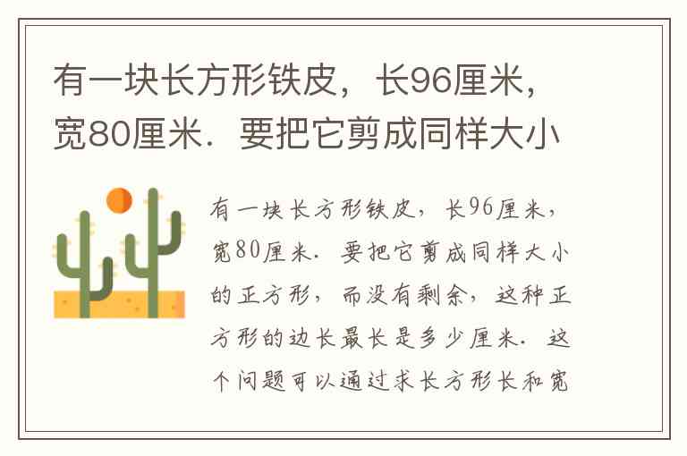 长方形的长是 96 厘米,宽是 80 厘米。要找出边长最长的正方形,我们需要找出 96 和 80 的最大公约数。