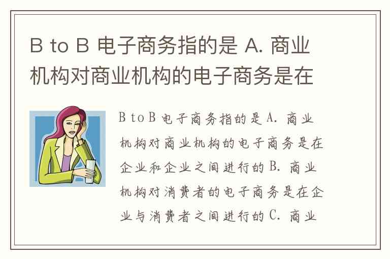 B to B 电子商务指的是 A. 商业机构对商业机构的电子商务是在企业和企业之间进行的 B. 商业机构对消费者的电子商务是在企业与消费者之间进行的 C. 商业机构对政府的电子商务是在企业与政府机构之间进行的 D. 消费者对政府的电子商务是政府对个人的