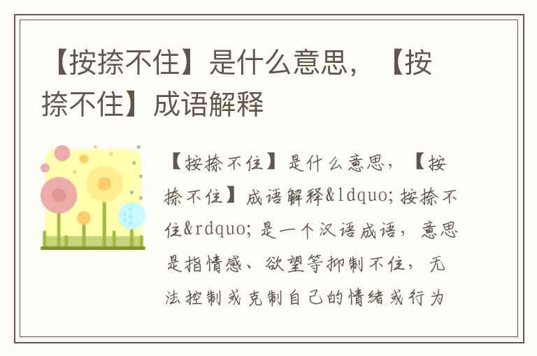 “按捺不住”是一个汉语成语,意思是指情感、欲望等抑制不住,无法控制或克制自己的情绪或行为。