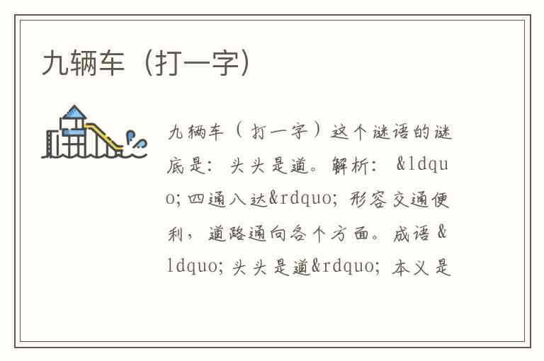 所以,整个谜面的逻辑是:九辆车 → 九 + 车 → 轨。这是一种非常直接的字谜解法。