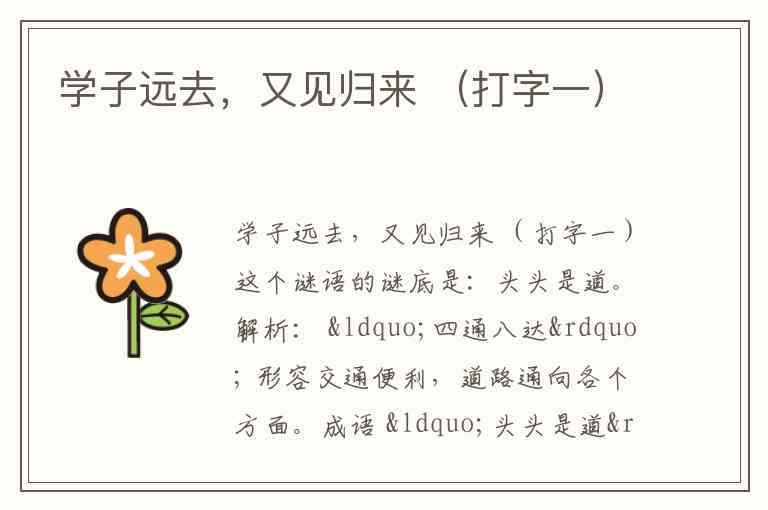 组合解读:综合来看,谜面的逻辑是:先通过“学子远去”得到“觉”字的上半部分(⺍),再通过“又见归来”提示加入“见”字,最终组合成“觉”字。整个谜语通过“去”和“归”的对比,生动地描述了“觉”字的构成过程。