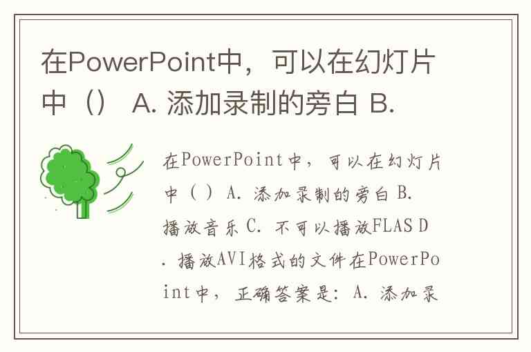 在PowerPoint中,可以在幻灯片中() A. 添加录制的旁白 B. 播放音乐 C. 不可以播放FLAS D. 播放AVI格式的文件