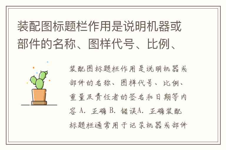 装配图标题栏作用是说明机器或部件的名称、图样代号、比例、重量及责任者的签名和日期等内容 A. 正确 B. 错误
