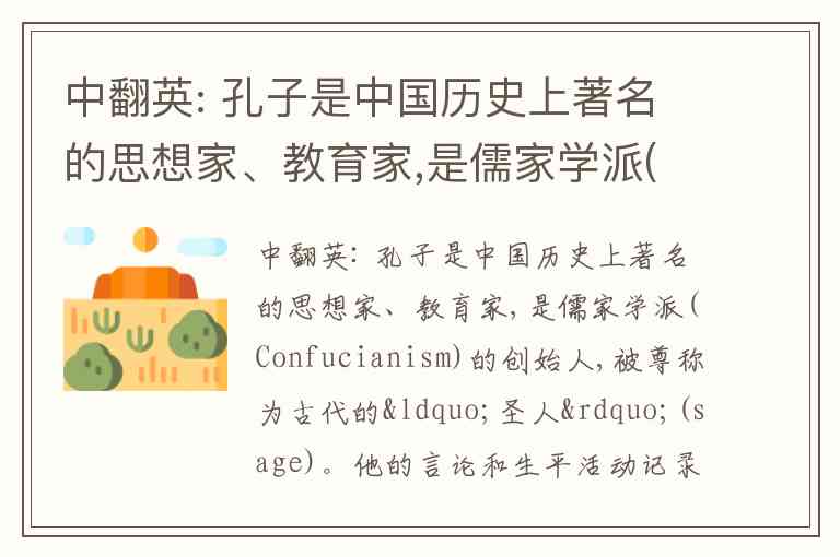 中翻英: 孔子是中国历史上著名的思想家、教育家,是儒家学派(Confucianism)的创始人,被尊称为古代的“圣人”(sage)。他的言论和生平活动记录在《论语》(The ects)一书中。《论语》是中国古代文化的经典著作,对后来历代的思想家、文学家、政治家产生了很大影响。不研究《论语》,就不能真正把握中国几千年的传统文化。孔子的很多思想,尤其是其教育思想,对中国社会产生了深远的影响。在21世纪的今天,孔子的学说不仅受到中国人的重视,而且也越来越受到整个国际社会的重视。 译文:Confucius was a great thinker and educator in Chinese history. He was the founder of Confucianism and was respectfully referred to as an ancient "sage". His words and life story were recorded in The ects. An enduring classic of ancient Chinese culture, The ects has had a great influence on the thinkers, writers, and statesmen that came after Confucius. Without studying this book, one could hardly truly understand the thousands-of-years' traditional Chinese culture. Much of Confucius' thought, especially his thought on education, has had a profound influence on Chinese society. In the 21st century, Confucian thought not only retains the attention of the Chinese, but it also wins an increasing attention from the international community.
