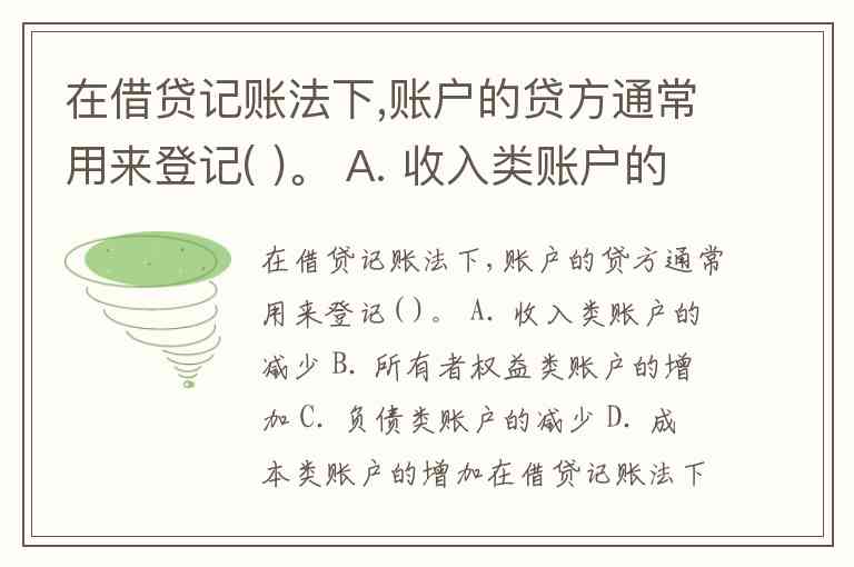 在借贷记账法下,账户的贷方通常用来登记( )。 A. 收入类账户的减少 B. 所有者权益类账户的增加 C. 负债类账户的减少 D. 成本类账户的增加
