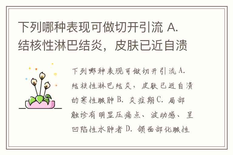下列哪种表现可做切开引流 A. 结核性淋巴结炎,皮肤已近自溃的寒性脓肿 B. 炎症期 C. 局部触诊有明显压痛点、波动感、呈凹陷性水肿者 D. 颌面部化脓性炎症,经抗生素治疗无效,同时出现全身中毒症状者 E. 儿童颌周蜂窝组织炎,出现呼吸困难及吞咽困难者