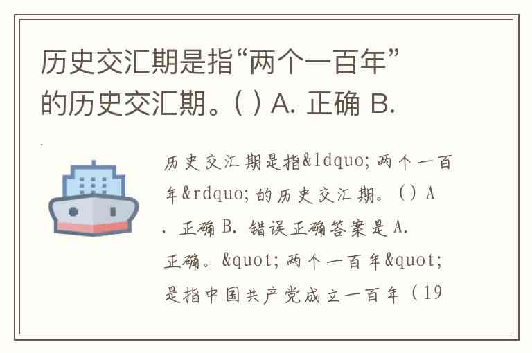 历史交汇期是指“两个一百年”的历史交汇期。( ) A. 正确 B. 错误