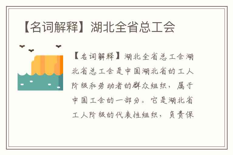 湖北省总工会是中国湖北省的工人阶级和劳动者的群众组织,属于中国工会的一部分。它是湖北省工人阶级的代表性组织,负责保护劳动者的合法权益,推动社会、经济、文化等方面的发展。全省总工会的主要职能包括:
