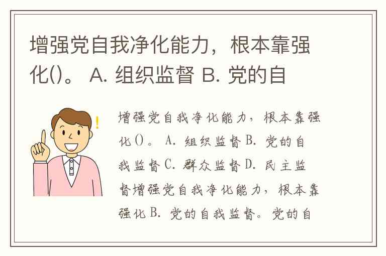 增强党自我净化能力,根本靠强化()。 A. 组织监督 B. 党的自我监督 C. 群众监督 D. 民主监督