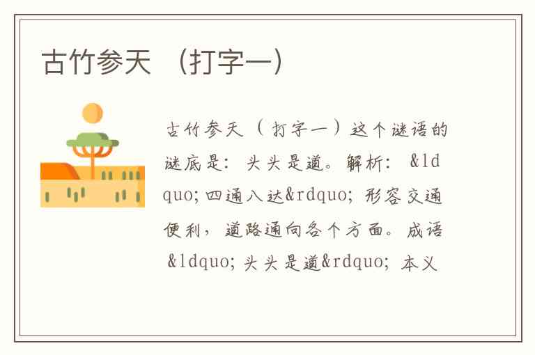 “参天”解析:“参天”意为“高耸入天空”,这里巧妙地会意指代“天”字。但谜语的妙处在于,“竹字头()”和“古”字组合后并不是一个完整的字。