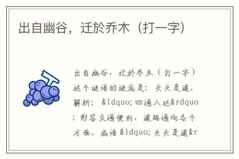 谜面出处与含义:谜面源自《诗经·小雅·伐木》中的“出自幽谷,迁于乔木”,原意是鸟儿从深谷飞出,迁徙到高大的树木上,常比喻人的地位上升或境遇变好 。