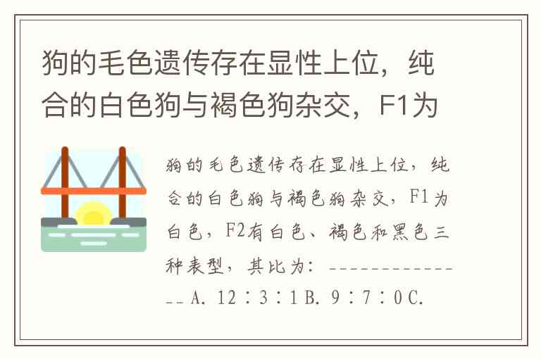 狗的毛色遗传存在显性上位,纯合的白色狗与褐色狗杂交,F1为白色,F2有白色、褐色和黑色三种表型,其比为:______________ A. 12∶3∶1 B. 9∶7∶0 C. 14∶1∶1 D. 9∶6∶1
