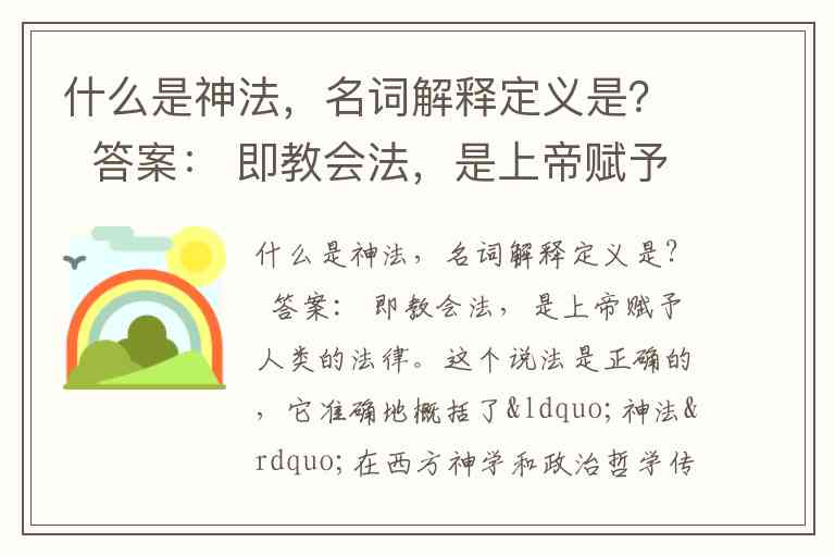 “神法”是上帝赋予人类的永恒律法,而“教会法”是其在中世纪基督教会中的具体化和制度化表现。这个定义抓住了“神法”作为神圣、普适和至高无上之法律的根本属性。