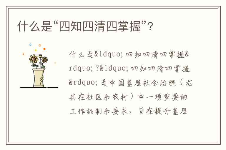 “四知四清四掌握”是中国基层社会治理(尤其在社区和农村)中一项重要的工作机制和要求,旨在提升基层组织(如社区居委会、村委会)的管理与服务效能,确保社会稳定。其核心内容是要求基层干部对辖区情况了如指掌。