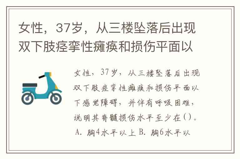 女性,37岁,从三楼坠落后出现双下肢痉挛性瘫痪和损伤平面以下感觉障碍,并伴有呼吸困难,说明其脊髓损伤水平至少在( )。 A. 胸4水平以上 B. 胸6水平以上 C. 胸8水平以上 D. 胸10水平以上 E. 胸12水平以上