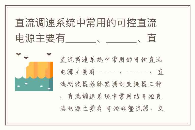 直流调速系统中常用的可控直流电源主要有 可控硅整流器、交直流变换器、直流斩波器或脉宽调制变换器三种。