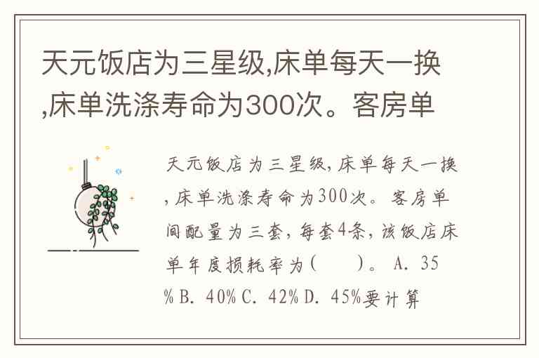 天元饭店为三星级,床单每天一换,床单洗涤寿命为300次。客房单间配量为三套,每套4条,该饭店床单年度损耗率为()。 A. 35% B. 40% C. 42% D. 45%