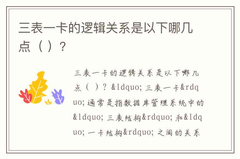 “三表一卡”通常是指数据库管理系统中的“三表结构”和“一卡结构”之间的关系。这在数据库设计中具有一定的逻辑意义,尤其在设计高效、规范的数据库模型时。虽然具体的解释可能有所不同,但通常的理解是: