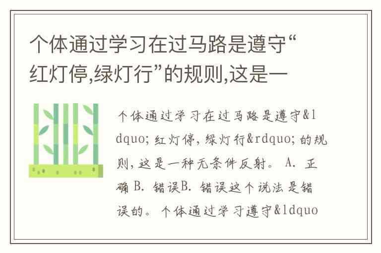 个体通过学习在过马路是遵守“红灯停,绿灯行”的规则,这是一种无条件反射。 A. 正确 B. 错误