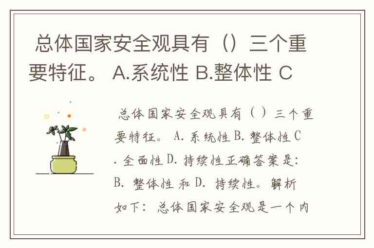 A. 系统性:虽然“系统性”思维是理解总体国家安全观的重要角度,但在官方概括其“重要特征”时,更精确的表述是“整体性”。“整体性”更强调各部分的有机统一和整体效能,而“系统性”更侧重于系统的结构和要素。