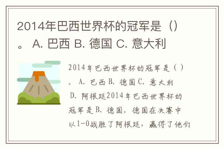 2014年巴西世界杯的冠军是()。 A. 巴西 B. 德国 C. 意大利 D. 阿根廷