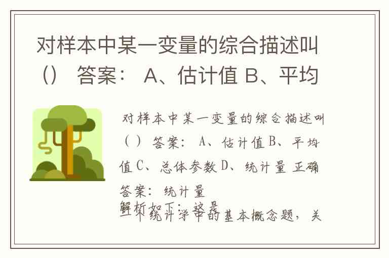 D. 统计量:是指由样本数据计算出来的,用来描述样本特征的概括性度量。例如,从1000名用户中抽出的100名用户的平均年龄,这个“平均年龄”就是一个统计量。题目中“对样本中某一变量的综合描述”正是指这类由样本计算出的指标。