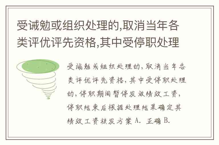 受诫勉或组织处理的,取消当年各类评优评先资格,其中受停职处理的,停职期间暂停发放绩效工资,停职结束后根据处理结果确定其绩效工资核发方案 A. 正确 B. 错误