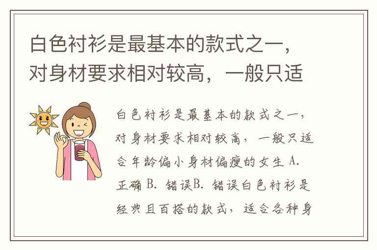 白色衬衫是最基本的款式之一,对身材要求相对较高,一般只适合年龄偏小身材偏瘦的女生 A. 正确 B. 错误