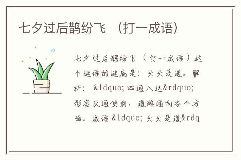 谜面“七夕过后鹊纷飞”描绘的正是七夕节一过,喜鹊便从鹊桥上四散飞走的场景。成语契合:成语“过河拆桥”的原意是比喻达到目的后,就把曾经帮助自己的人一脚踢开。