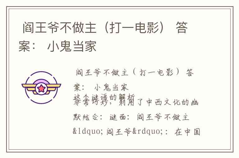 结论:所以,“小鬼当家”正好对应了“阎王爷不做主”的局面。谜底正是美国经典喜剧电影 《小鬼当家》 的中文译名。这个译名与谜面形成了完美的呼应。