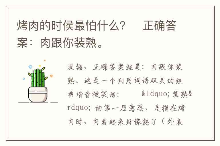 所以,这个笑话巧妙地将烤肉时最让人头疼的情况(判断肉是否真熟)和一种人际交往中的幽默现象(别人跟你装熟)结合了起来,造成了出人意料的幽默效果。