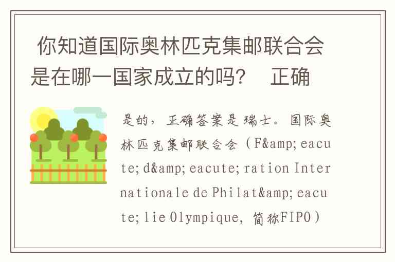 国际奥林匹克集邮联合会(Fédération Internationale de Philatélie Olympique, 简称FIPO)于 1983年 在 瑞士洛桑 成立。