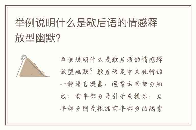 歇后语是中文独特的一种语言现象,通常由两部分组成:前半部分是引子或提示,后半部分则是根据前半部分的线索来表达的意思或带有某种情感的反转,后半部分常常带有讽刺、幽默或夸张的意味。歇后语的“情感释放型幽默”则是在使用时,通过语言的反转或夸张释放出某种情感,如讽刺、调侃、或者自嘲等,达到一种情感表达和幽默效果。