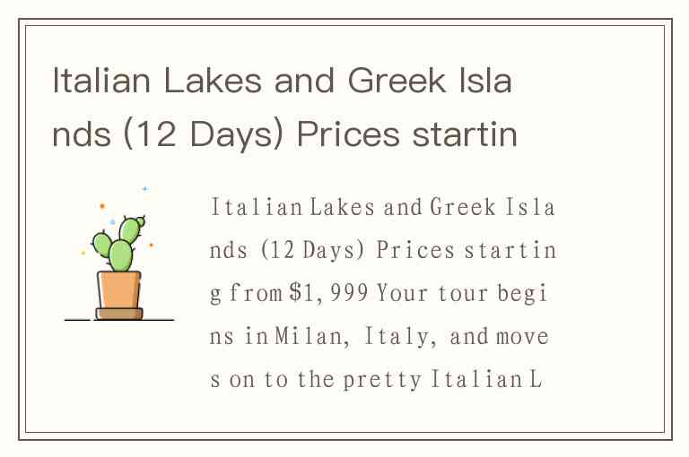 Italian Lakes and Greek Islands (12 Days) Prices starting from $1,999 Your tour begins in Milan, Italy, and moves on to the pretty Italian Lake District and the attractive resort of Stresa, your home for two nights. Collette Vacations has carefully chosen the Costa Victoria as your home away from home for your 7-night journey along the waterways of Mediterranean. The cruise ship is filled with the warmth and culture of Italy and is richly designed with entertainment areas and very good living conditions. It will take you to the places of your dreams. You’ll spend 4 days touring Greek cities you’ve always heard about. In Katakolon, you will have the only unguided tour to nearby Olympia on the whole journey. Then with a local guide you will visit the Greek islands of Santorini, which is often related to the story of the lost city of Atlantis , and Mykonos, a wonderful island with beautiful beaches. Your journey ends in Verona, home of the love story Romeo and Juliet, with a fun-filled farewell dinner— perfect ending to a pleasant journey. 12 Days, 25 Meals: 10 Breakfasts, 6 Lunches, 9 Dinners Day 1 Overnight flight to Italy Day 2-3 Regina Palace, Stresa, Italy Day 4-10 Costa Victoria (Costa cruises) Day 11 Hotel Leopardi, Verona, Italy Day 12 Leave for home Please Note: Leaving date Price for one person April 7 $2,099 June 2 $2,199 October 6 $2,099 November 3 $1,999 小题1:How is the journey planned? A.It starts and ends in Italy B.It starts and ends in Greece C.It starts in Italy and ends in Italy D.It starts in Greece and ends in Italy 小题2: What can be inferred from the travel plan? A.The price may get lower than those in the plan. B.The prices include three meals a day. C.The price is the highest in summer. D.The prices include entertainment service. 小题3:What does the underlined part “the Costa Victoria” most probably refer to? A.A famous hotel B.A beautiful resort C.A comfortable ship D.A long-distant bus 小题4: Tourists will travel on their own in_________. A.Stresa B.Olympia C.Mykonos D.Verona