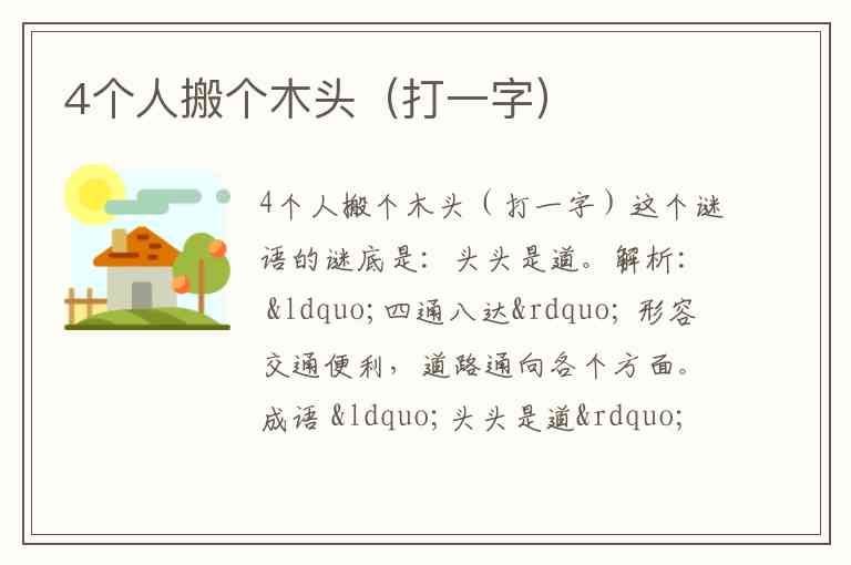 根据谜面“4个人搬个木头”,谜底是 “杰” 字。