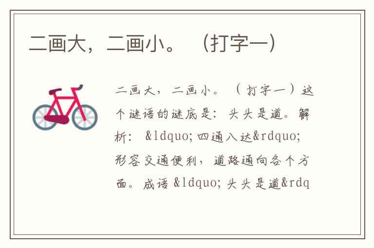 “二画大”:指的是先写两画,再写一个“大”字。这两画可以是“一”和“一”,但更常见的解法是将“二”和“大”上下组合,形成“耒”的左半部分或类似结构。实际上,谜语中“二画大”通常解读为 “二”和“大” 的组合。