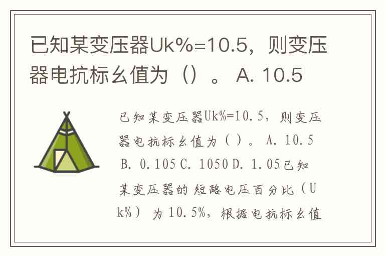 已知某变压器Uk%=10.5,则变压器电抗标幺值为()。 A. 10.5 B. 0.105 C. 1050 D. 1.05