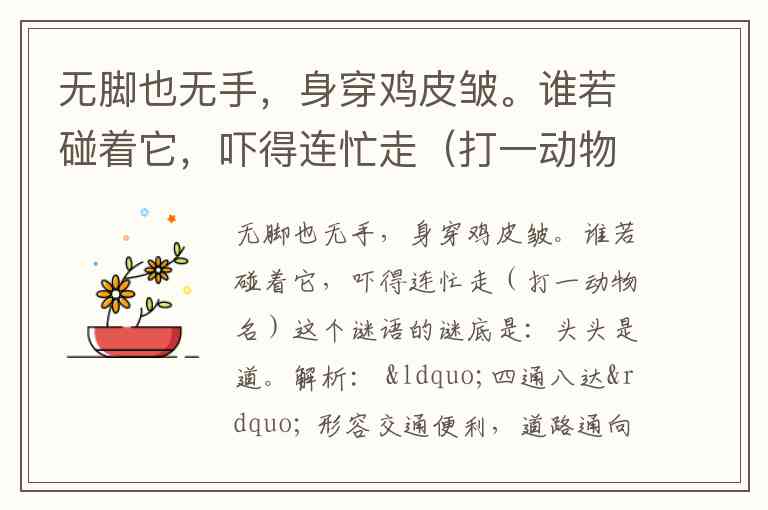 无脚也无手,身穿鸡皮皱。谁若碰着它,吓得连忙走(打一动物名)